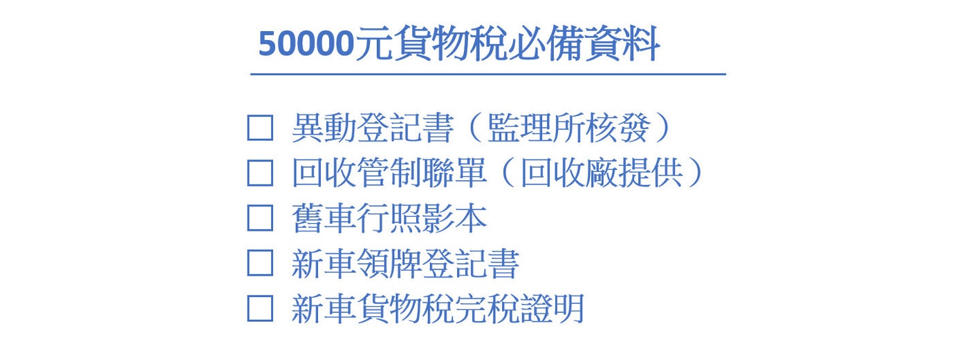 車體與車籍回收報廢完成後的6個月內若有購入新車,還可以再申請50000元的貨物稅減免,這部分則是可以在購車時請車行協助跟政府申請,由於車行申請後再加上國稅局以及海關審查時間,撥款後再到車主手上約需要3個月以上的時間。原則上報廢時所獲得的資料包含異動登記書、回收管制聯單這兩份可以多複製幾份,無論是申請貨物稅或報廢都必須要用到。